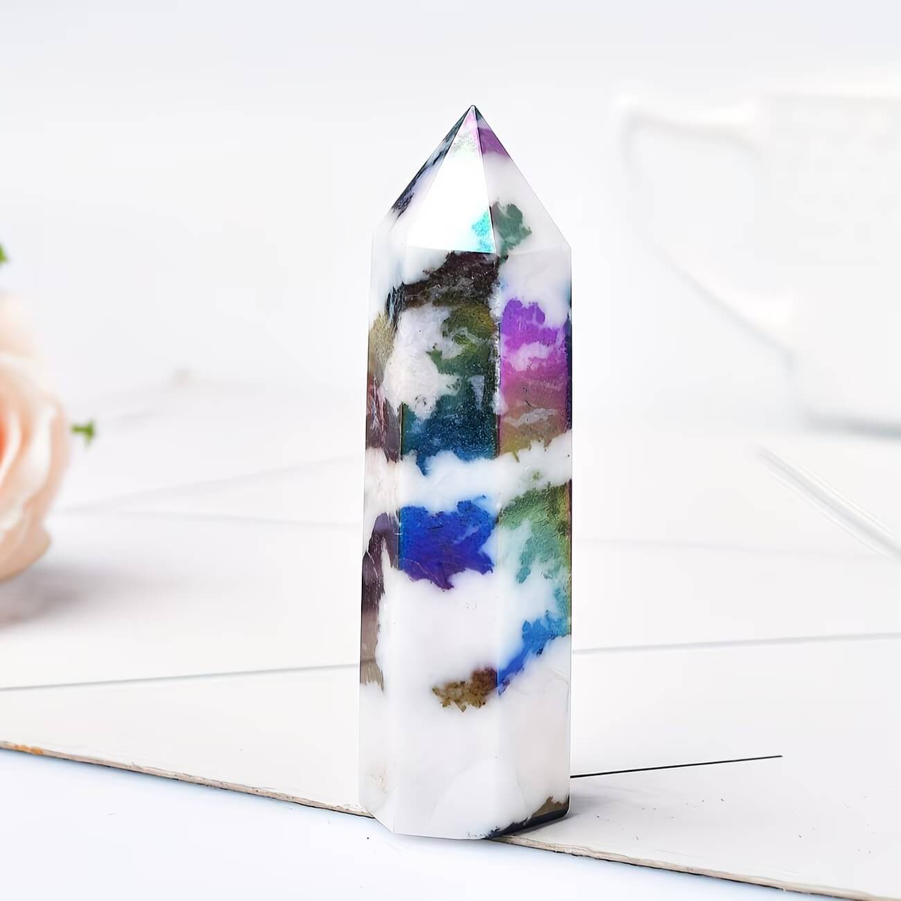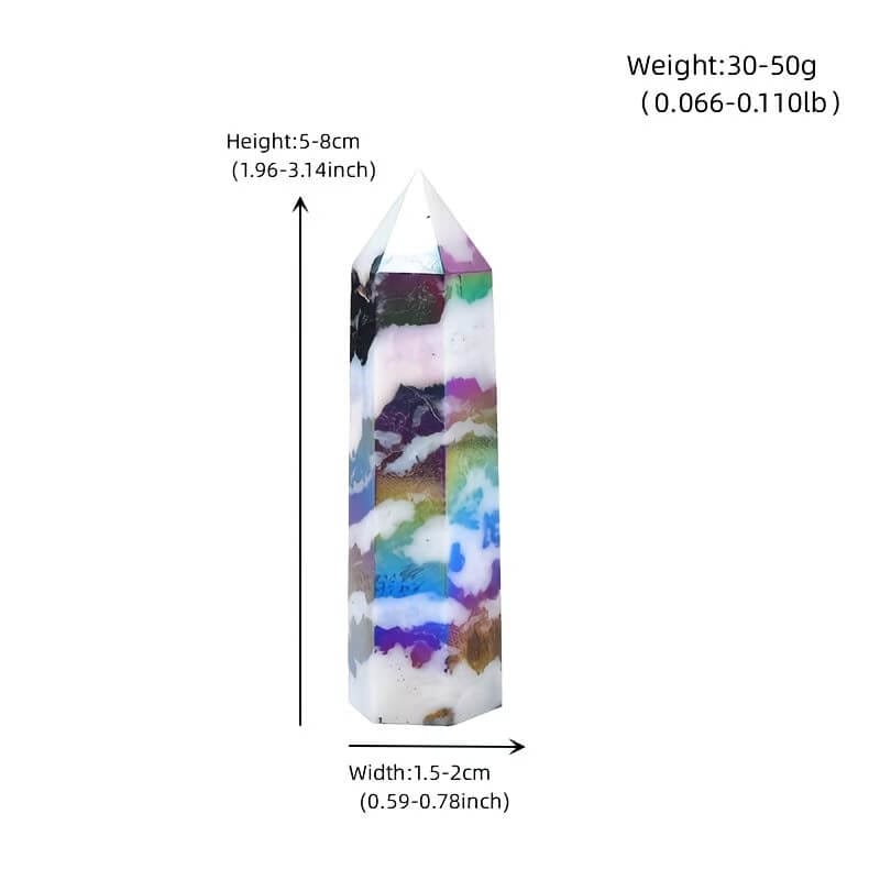 The rainbow zebra quartz crystal point can help you balance your own energy, enhance your spiritual connection and resonance with the universe, and enable you to fully accept and uplift yourself.