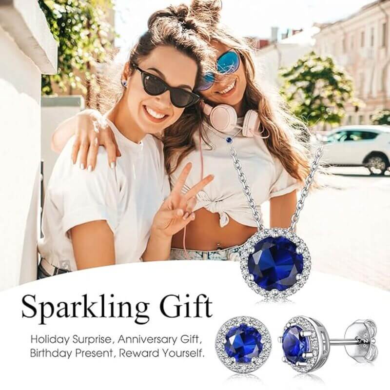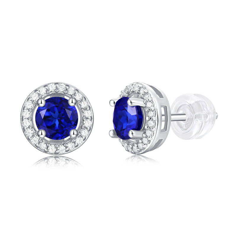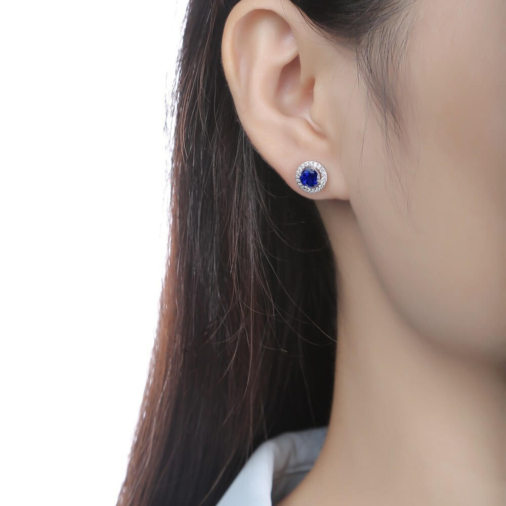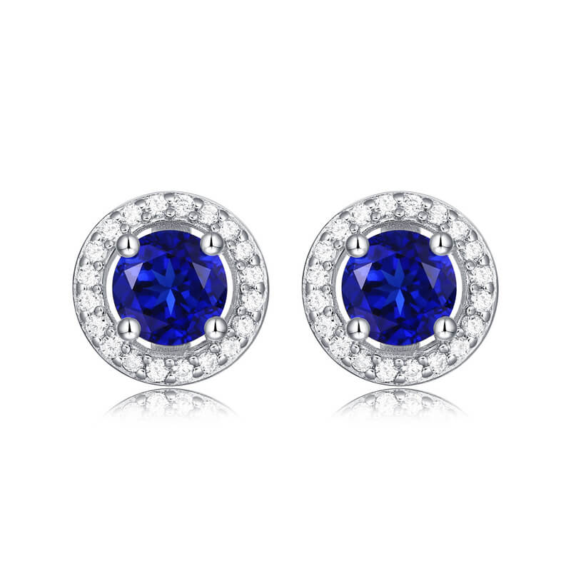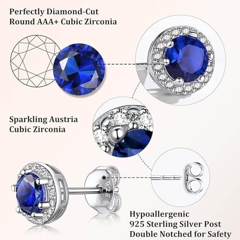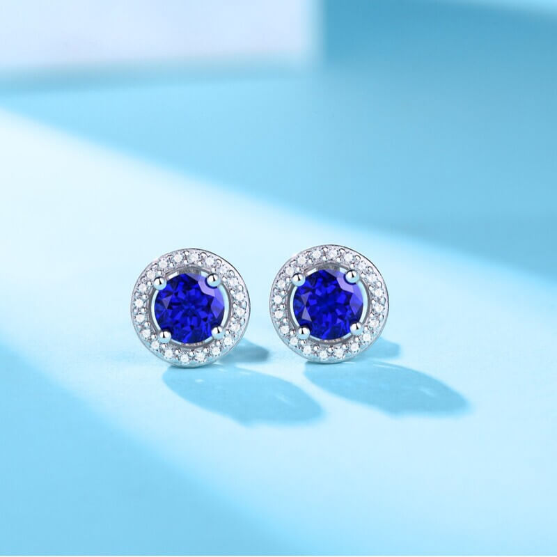 Sparkling 925 Sterling Silver 8mm Round Blue Sapphire Stud Earrings​ with Zircon
