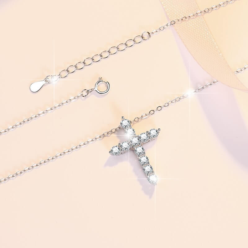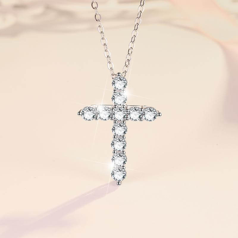 - This moissanite cross pendant necklace is designed with a classic cross shape and interlaid with premium moissanite diamonds. You can get a sparkling effect with these D color moissanite diamonds.